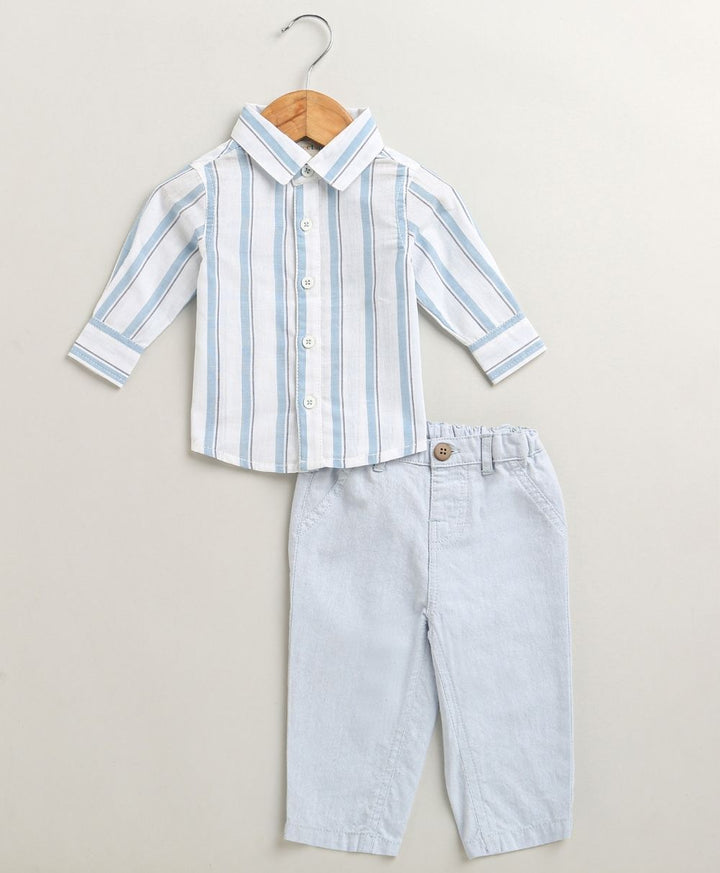 Dress your little gentleman in effortless style by Sweetlime By AS with our Blue Stripes Set! This adorable two-piece outfit features a soft cotton shirt with soothing Blue and white stripes, paired perfectly with light pastel blue pants. Designed for all-day comfort, the shirt’s breathable cotton fabric keeps your baby cool, while the elastic waistband pants ensure an easy, snug fit. Ideal for casual outings, play dates, or family gatherings — this set adds a fresh and classy touch to your munchkin’s wardrobe!