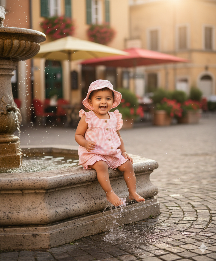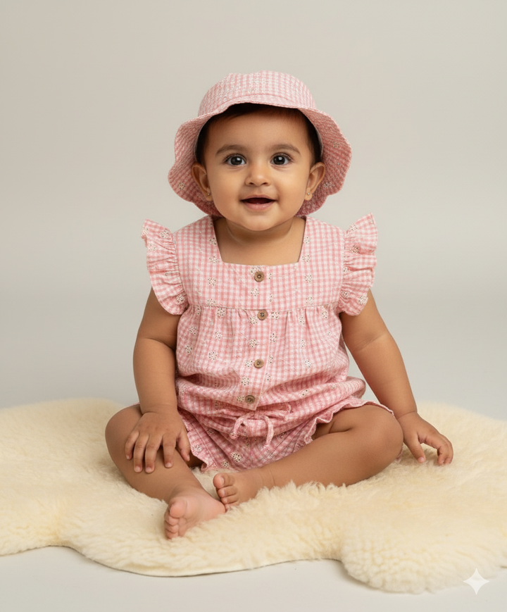 Dress your little sunshine in the Soft Pink Gingham Daisy Co-ord Set with a Hat by Sweetlime By AS. The set features a ruffle-sleeve buttoned top, elasticated shorts, and a matching scalloped-edge hat. The soft pink fabric is beautifully detailed with tiny embroidered white daisies, making it perfect for playful summer days. The breathable organic cotton blend ensures all-day comfort, while the charming ruffles add a sweet touch of style. Ideal for casual outings, picnics, or a day in the sun, this set keeps your baby girl both cute and comfy.