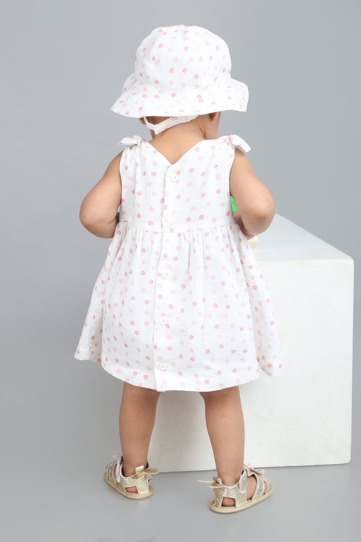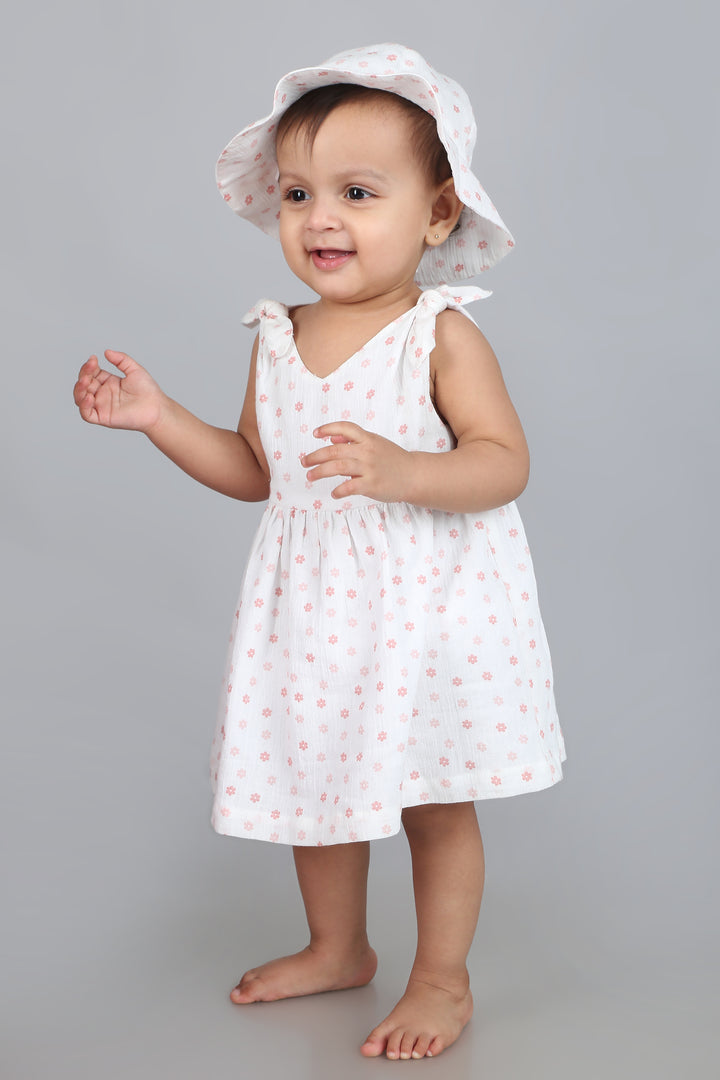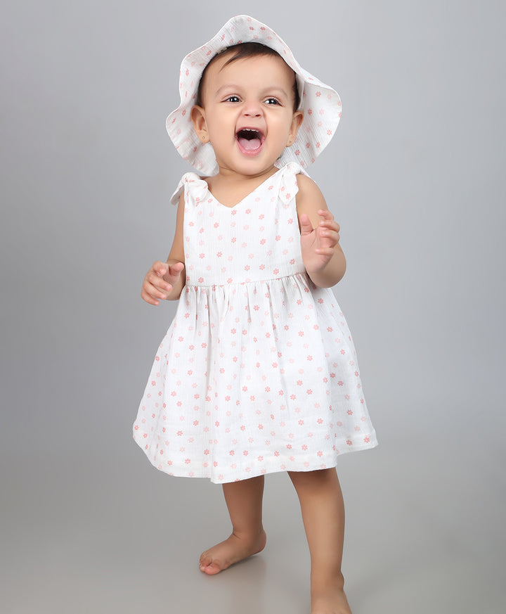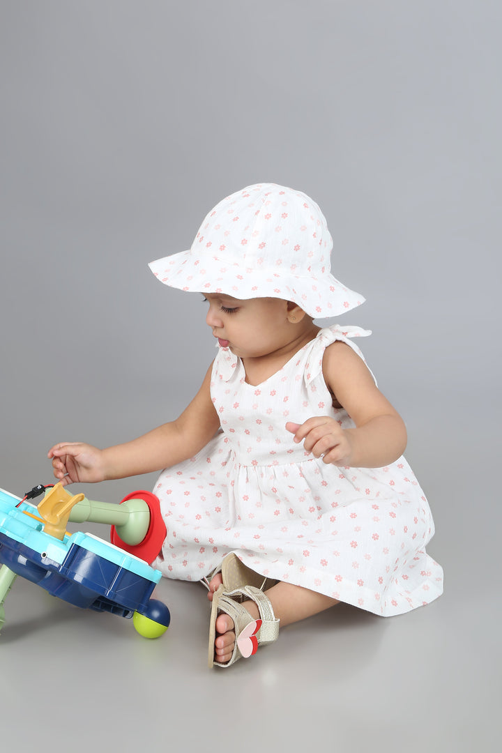 Sweeten up summer days with the Cherry Petal Co-ord Set by Sweetlime By AS. This 3-piece delight made for your little blossom includes a dress, a bloomer and a hat. Crafted from soft, breathable cotton crepe fabric with a crinkled texture, this sleeveless dress features a sprinkle of dainty pink floral prints over a fresh white base. The knotted shoulder straps add a playful touch, while the gathered waist offers gentle flow and comfort. Paired with a matching bloomer and an adorable wide-brimmed hat, this outfit is perfect for sunny strolls, park picnics, or baby’s first vacation. A charming blend of style and softness, ideal for warm-weather wardrobes.