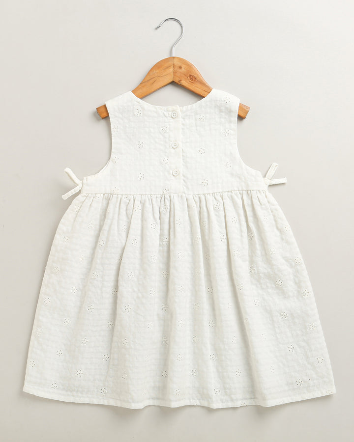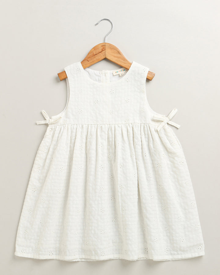 A classic, breathable white organic cotton sundress designed for comfort and style by Sweetlime By AS . It features a simple round neck, a gently gathered skirt, and sweet tie-details on the shoulders. Includes a coordinating bow hairband . Ideal for warm weather and special occasions.