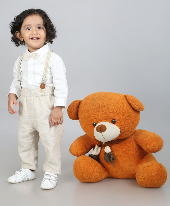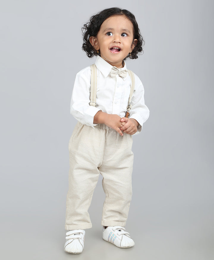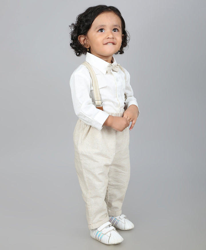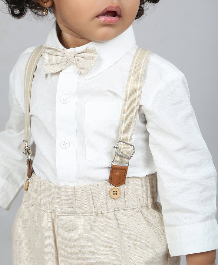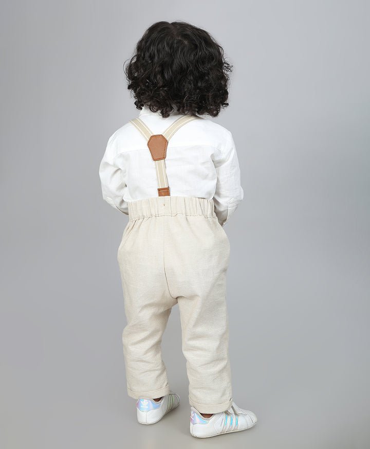 Add a dash of vintage charm to your little one’s wardrobe with our White & Beige Little Gentleman Formal Co-ord Set. This 3-piece outfit by Sweetlime By AS includes a crisp white button-down shirt, paired with beige trousers and coordinating cream suspenders with leather accents. A matching bow tie completes the look, making it effortlessly elegant for any formal occasion — from weddings to birthday parties. Designed with comfort in mind, the elasticated waistband and soft cotton fabric allow for ease of movement while keeping your little gentleman looking picture-perfect. A timeless outfit for unforgettable moments.