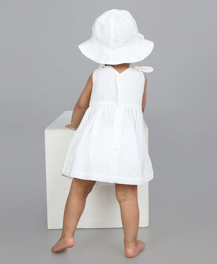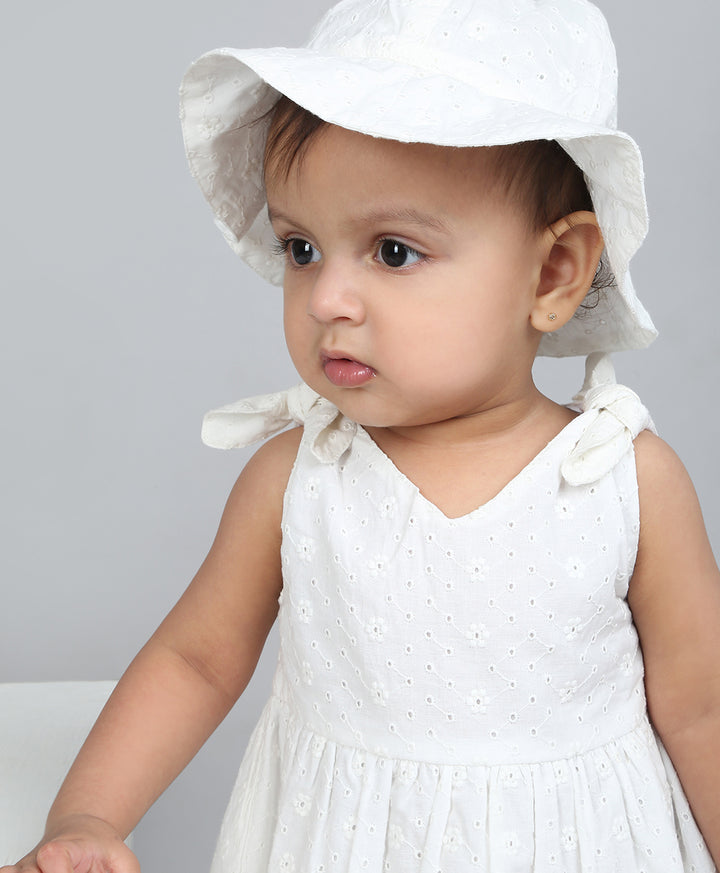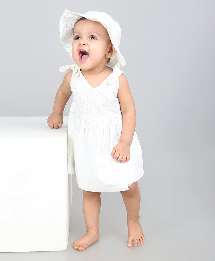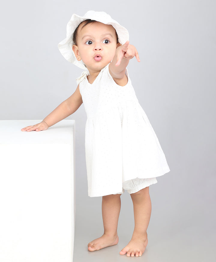 Let your little one bask in sunny charm with the Daisy Breeze Organic Cotton Co-ord Set by Sweetlime By AS. Crafted from soft, breathable organic cotton fabric, this all-white ensemble includes a sleeveless eyelet dress with dainty shoulder bows, a comfy bloomer, and a matching sun hat for complete summer style. The delicate embroidered details and gathered waistline add a touch of elegance, making it perfect for sunny strolls, picnics, or beach days. Light, airy, and irresistibly cute—this set is the ultimate warm-weather essential for baby girls.
