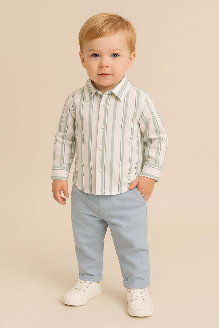 Dress your little gentleman in effortless style by Sweetlime By AS with our Mint Stripes Set! This adorable two-piece outfit features a soft cotton shirt with soothing mint and white stripes, paired perfectly with light pastel blue pants. Designed for all-day comfort, the shirt’s breathable cotton fabric keeps your baby cool, while the elastic waistband pants ensure an easy, snug fit. Ideal for casual outings, play dates, or family gatherings — this set adds a fresh and classy touch to your munchkin’s wardrobe!