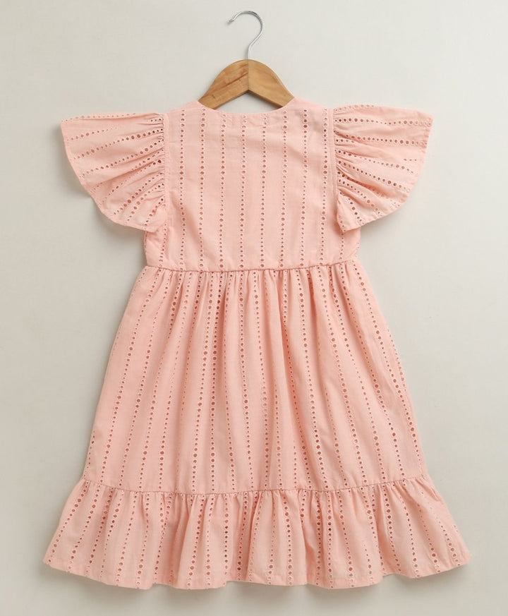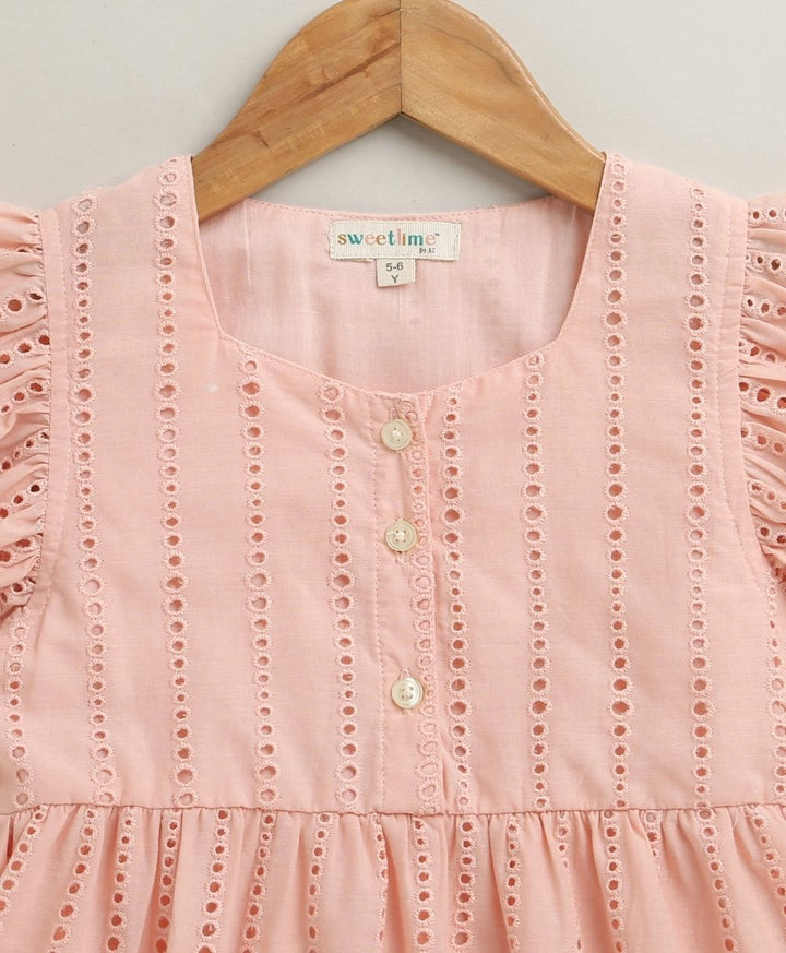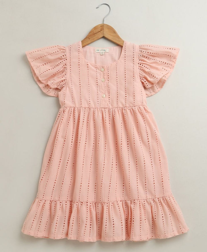 Elevate your kids elegance with this pastel pink Schiffly dress by Sweetlime BY AS. Its fit and flare silhouette flatters, Adorned with delicate detailing and featuring gathered short sleeves. Finished with a back button for a touch of sophistication.