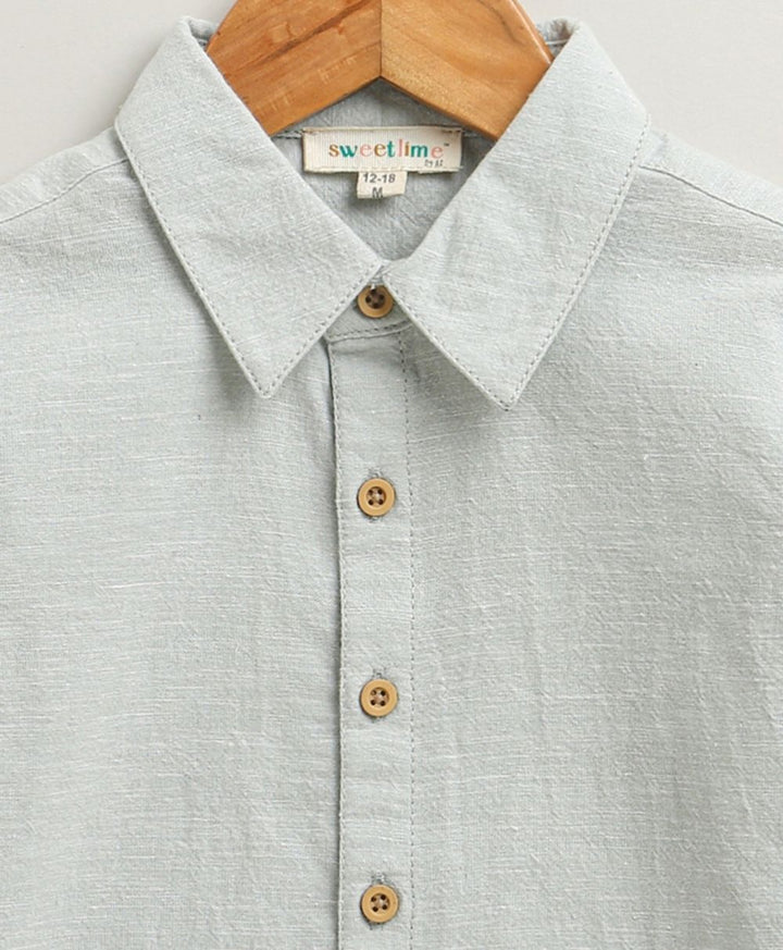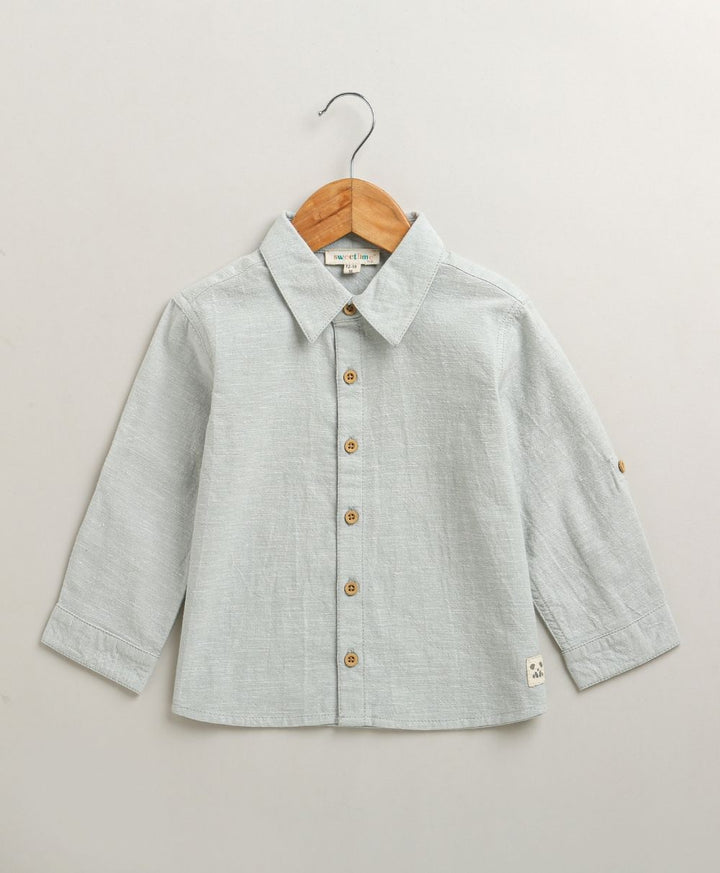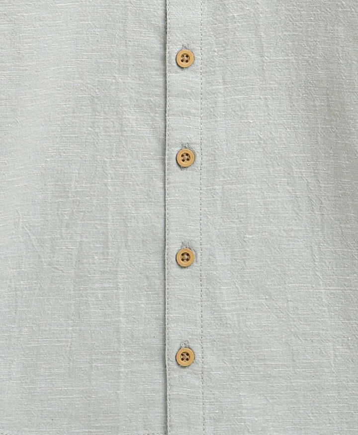The soft, textured cotton shirt comes in a refreshing light mint green color and features a simple, smart collar. It has a full placket with natural, round buttons that provide a nice detail. The sleeves can be worn down or secured with the button tab for a cuffed look.