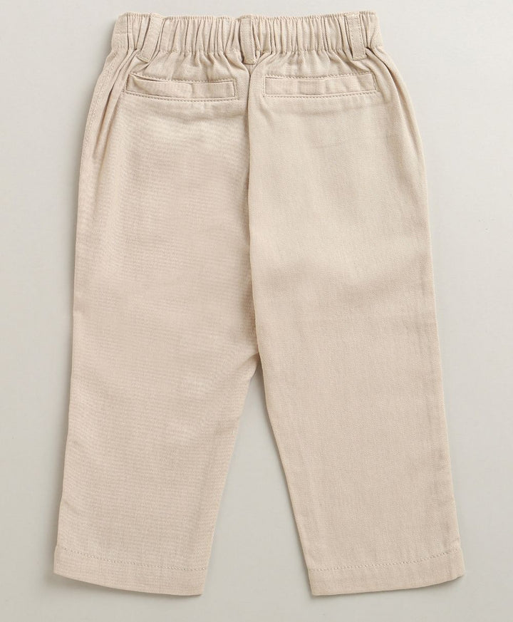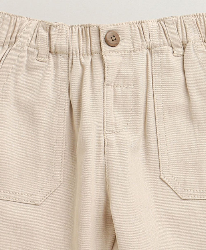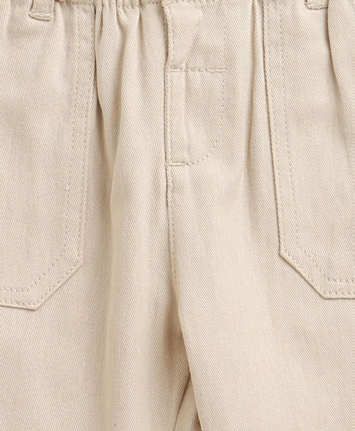 The bottoms are casual, straight-cut trousers in a versatile light khaki or natural oatmeal color. They boast a super comfortable scrunchie elastic waist—perfect for quick changes and all-day wear. The design is finished with two practical patch pockets on the front, completing the look with a practical, ready-for-adventure aesthetic.
