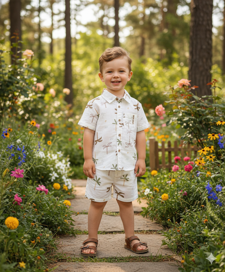 Bring vacation vibes to your little one’s wardrobe with the Tropical Breeze Cotton Co-ord Set by Sweetlime By AS. This lightweight 2-piece outfit features a short-sleeve button-down shirt and matching shorts, both made from soft, breathable double cloth cotton fabric. The playful palm tree print in earthy greens and browns adds a cool island flair, perfect for beach outings, playdates, or warm-weather lounging. The shirt comes with a tiny front pocket for extra charm, while the elasticated shorts ensure comfort and easy movement all day long. A breezy and adorable look for sunny days ahead!
