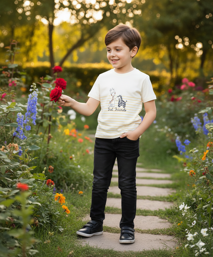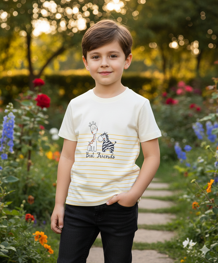 Celebrate friendship with the Unisex Best Friends T-shirt by Sweetlime By AS. This charming coloured t-shirt features cheerful yellow stripes and an adorable illustration of a giraffe and zebra cuddled close, with the sweet message “Best Friends” underneath. Made from soft, breathable cotton, it’s perfect for playful days and cozy moments. A delightful pick for little ones who love animals, adventure, and their besties!